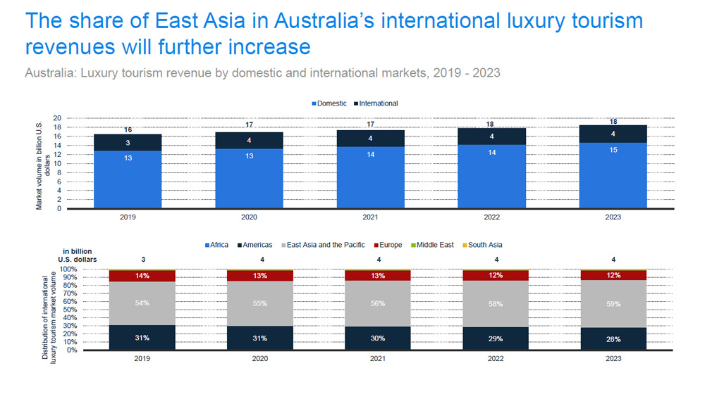 For Australia, Statista says luxury tourism revenue is currently valued at US$16 billion, of which $13 billion is spent domestically. That number is predicted to stay flat in 2020, whereas international luxury tourism will rise from US$3 billion to US$4 billion. By 2023, Australia’s luxury tourism revenue is expected to top US$18 billion, driven by domestic travellers (at approximately US$15 billion).