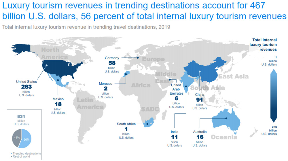 The data revealed by Statista shows predominant trends, such as the most significant travel destinations per region and a revenue forecast for up to 2023. The United States currently has the biggest luxury travel market with a value of nearly US$263 billion in 2019. The USA is followed by China in second with a market value of nearly a third of that of America, at approximately US$91 billion. Germany accounted for US$58 billion and Mexico US$18 billion.