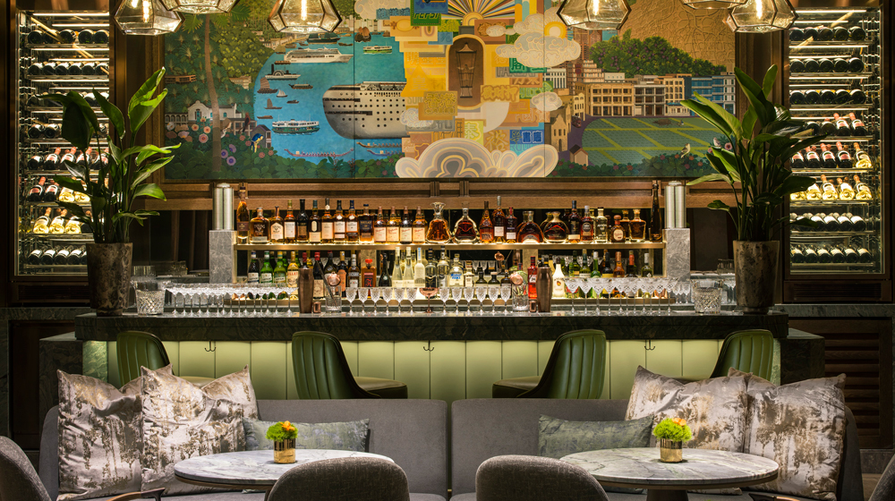 But it was time to see André Fu’s latest Hong Kong hotel, St Regis, next to the headquarters of its owner, China Resources Company. Its Chairman, Fu Yuning, wanted something that showed old Hong Kong as well as globalism-2020, and apparently André Fu travelled extensively around the city making notes. As soon as you rise to the second floor lobby, indeed, there is a sense of elegance and tradition, especially if you happen to arrive at 5.30 pm, the moment of the daily sabrage. The young sommelier did a superb job in slicing off the bottle tops, and then the gal was shown some of the unique drinking vessels from a bar that, true to brand form, has a unique painting, a collage of Hong Kong, covering the entire back wall.