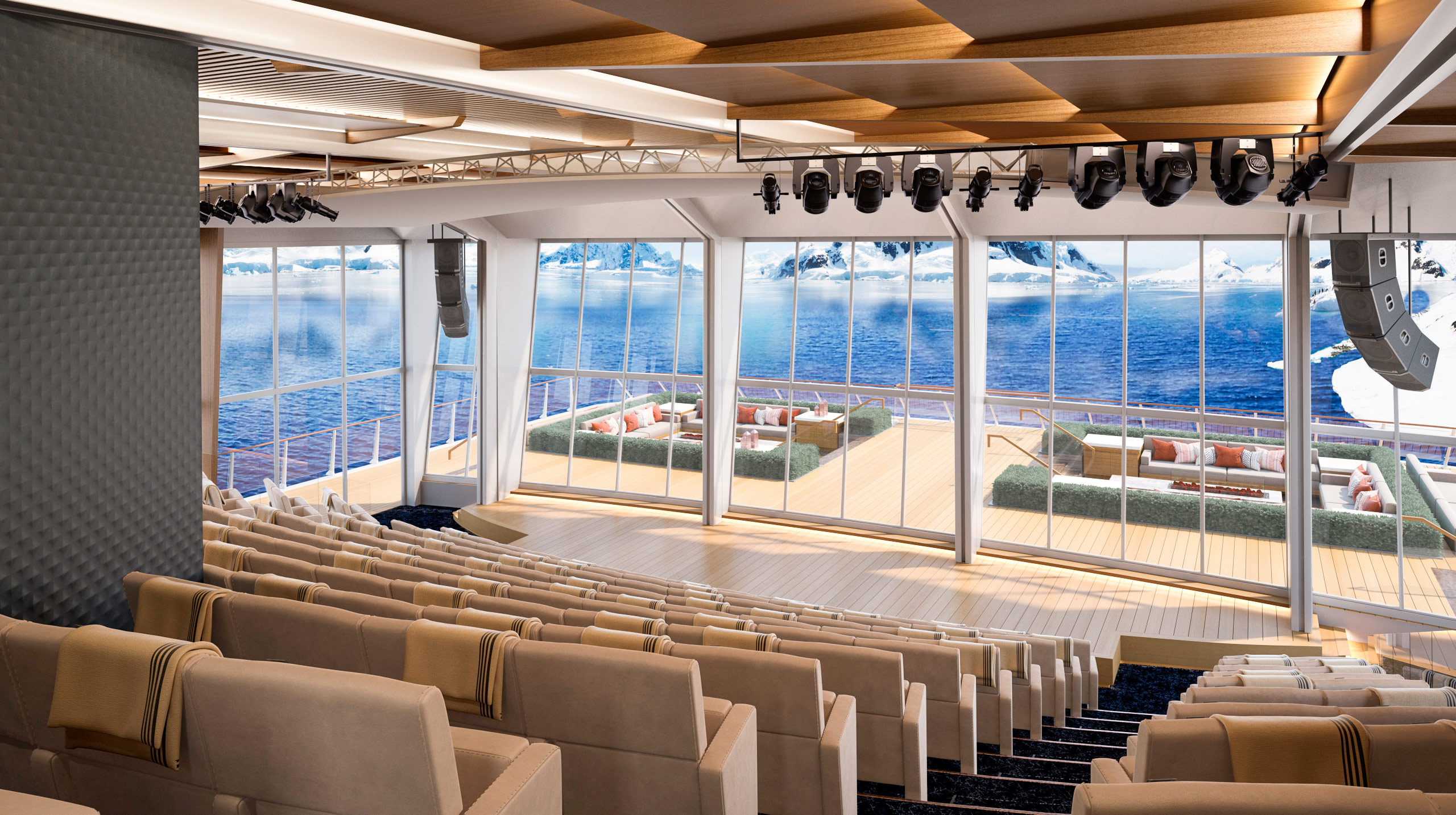 The Aula & Finse Terrace: Viking has created the world’s most advanced venue for learning at sea with The Aula, a stunning panoramic auditorium at the stern. Inspired by the University of Oslo’s famed ceremonial hall where the Nobel Peace Prize was historically awarded, The Aula will offer a dynamic venue for lectures and entertainment, with floor-to-ceiling windows and 270-degree views.