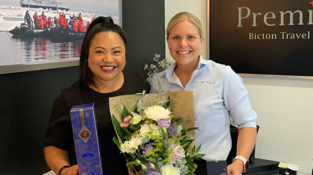 Lead image: Nadia Redman (right) from Bicton Travel receives her Campioni di Silversea gifts from Rebeka Belcher, BDM Silversea Cruises.