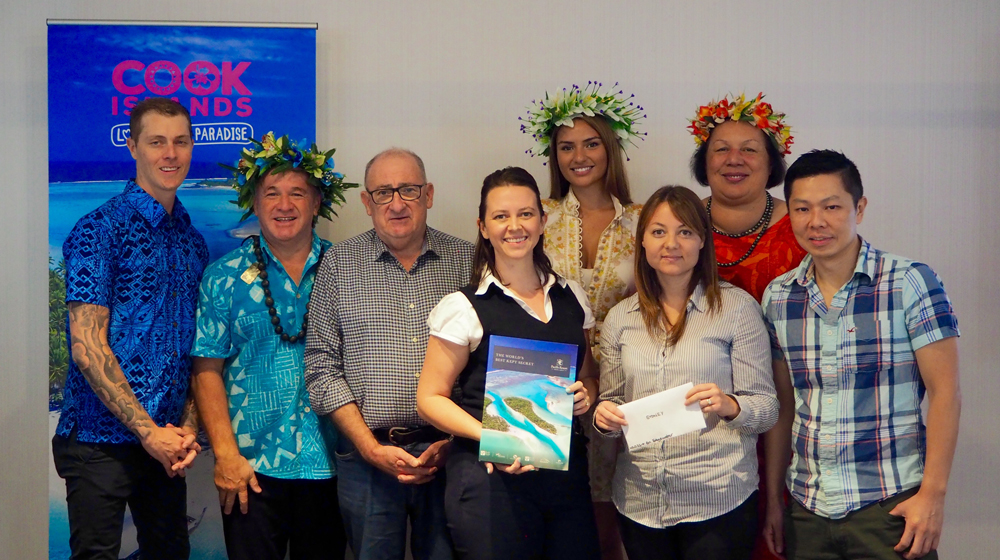 Lead image: Sydney Prize Winners – from left to right – Matt Brookfield, Cook Islands Tourism Australia; Paul Lynch, Cook Islands Holiday Villas; David Lyons, Horizons Cruise & Travel; Peta Kensit, Flight Centre Business Travel; Lydia Tariu Simonis, Former Miss Cook Islands in the Miss Cook Islands Pageant Association; Maria Debole, Travel Australia Centre; Mereana Taruia, Edgewater Resort Rarotonga and Jake Chiem, Travelcation.