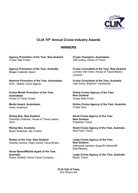 “This year’s winners reflect an increasing level of dedication among travel agents when it comes to engaging with their clients and developing their cruise business,” Katz commented. “Their passion for cruising is stronger than ever and a sign of the growing levels of expertise among cruise specialists right across the Australasian travel trade.”
