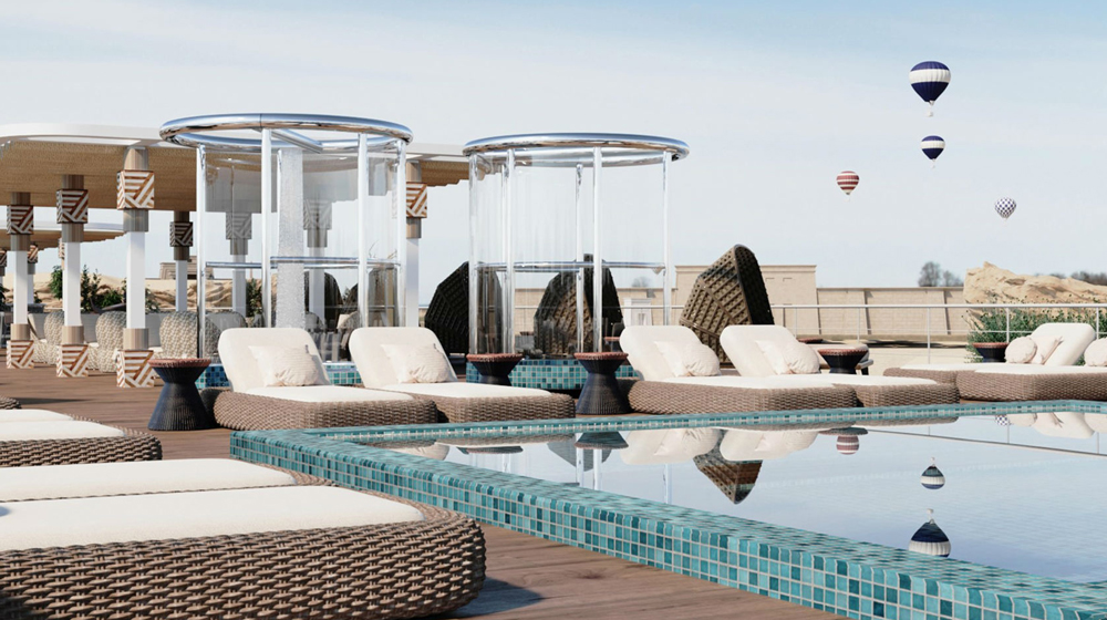 The Nile cruise component will be aboard the new-build 68-passenger AmaDahlia river cruise ship. The five-deck AmaDahlia will feature 10 Standard staterooms and 24 suites, the top of the line being the Lux Suite, positioned on the Lily Deck (middle deck), at the bow beneath the wheel house. Renderings of the ship suggest higher-class cabins and suites will offer French balconies.