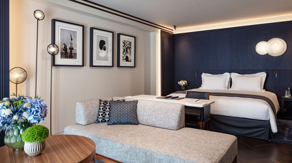 After a sunny walk, south through the Tuileries, across the Seine and past a long snake of culture seekers waiting to get into Musée d’Orsay, I could see the hotel on Blvrd Raspail from two blocks away. Now that the stone exterior has been washed and scrubbed within an inch of its life it has even more Gaudi-like features. The 450 team members are dressed by Gaspard Yurkievich; young men in soft flat caps and long winter coats manned the 180-degree automatic door (they were not needed, in fact, they merely supervised). Inside, I looked along designer Jean-Michel Wilmotte’s lobby, a wedding cake of illuminated arches (perhaps half a dozen in all), white stone and lots of lights… where did this lead to? Offset to the right was the Conciergerie. Eight metres further on, slightly off to the left was the reception, a dark-veneer lacquer fence. Behind were men in more of the many-shades-of-grey and a charming young lady from Tianjin who must have realised that her blue dress did not quite fit and, because of the fabric used, looked far removed from Paris catwalks.