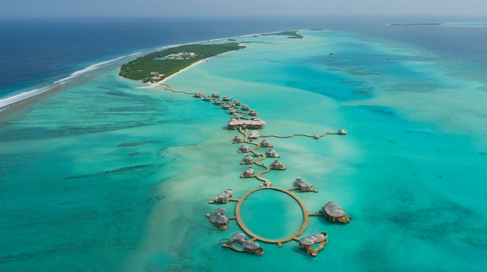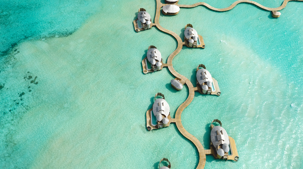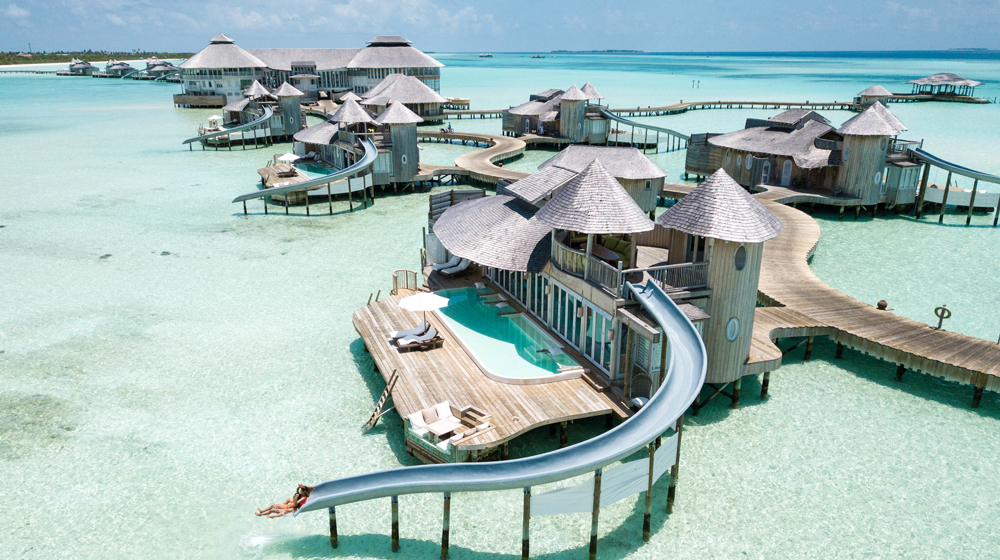There is no norm in the Maldives. However, arguably the most abnormal of the whole offering is Soneva Jani, which opened in October 2016. As the speedboat arrives, I begin to see a string of topsy-turvy Heath Robinson structures, two- or three-floor sculptures on poles sticking high up out of the water. At Villa 14, swirling tubes come out of the top floor and curve down into the water (these later prove to be resin water-chutes, formed here on the island and a great marketing tool as kids persuade parents to come to this resort simply for a ride).
