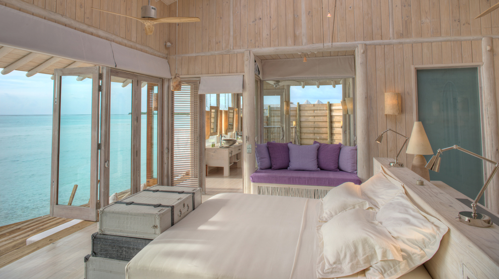 Villa 14 is an artwork of New Zealand eucalyptus and other sandblasted woods, including pine. Outside are two bikes, with purple fabric seats and pedal covers. My butler opens the door, surprisingly using an old-fashioned metal key. I look across a 4.5-metre-deep living room space out to the ocean. The floor has a curvilinear window in it, looking down to the blue water. The only colour is green or pale purple cushions, and apple-green ceramic toiletry covers. Thirty wood stairs lead to my rooftop, for sunbathing and al fresco dining. My 13-metre-long pool has three fixed over-hammocks and a ladder directly to the sea. I have a FrancisFrancis espresso machine, a Wineart two-bottle cooler, juicer and kettle, and a silver Smeg. From the bed, I look through three pairs of French windows to the water. I look up to a soaring cathedral ceiling with a panel that can slide back completely, to the open air.