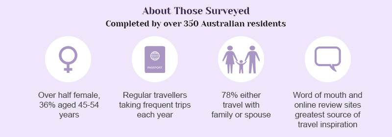 Three hundred and fifty-seven Australian residents undertook the online survey during the last two weeks of May 2020. 74% of respondents were female, with most being aged between 45 to 54 years (36%) or 25 to 34 years (28%). 14% were aged 55 years or older. 50% said they took frequent holidays throughout the year while 41% said they usually planned for one large trip per year. 47% said they most often travelled with family, 31% said they travelled with their spouse and 16% said they most often travelled with friends. 6% said they most often travelled alone.