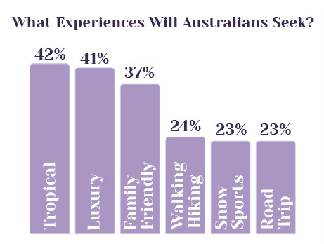 As we head into winter in Australia, unsurprisingly a tropical experience was nominated by nearly half of all respondents, while 41% said a luxury stay would be topping their holiday choice. 37% will be seeking family-friendly and/or multi-destination experiences, with others seeking something more active such as a walking/hiking (24%) or snow/skiing (23%) holiday.