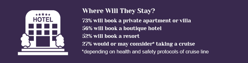 While pre-COVID-19 most respondents said they usually booked travel independently (61%), post-COVID-19, 81% said they would or may consider booking a resort package holiday, while 57% said they would or may consider booking a group package holiday. Over 25% said they would be more likely to use the services of a travel advisor post-COVID-19.