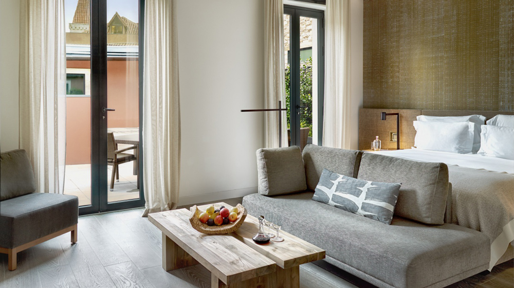 I entered Six Senses Douro Valley at the top, on the eighth floor, and looked through picture windows at hillsides of terraced vineyards. Back down on the fourth floor, we walked to the 70-square-metre end room, number 406. It was taupe throughout, from the unpolished wide board wood floor and walls to the six-person L-shaped sofa, with an off-white mansard ceiling above. A trio of three-metre-high French windows leads to a balcony. They, and two more windows, all have hand-operated floor-length taupe gauze curtains and easy-operated electric black-out blinds. The main room’s centrepiece is a raised bathtub, encased in a taupe marble coffin. The main bathroom, in an alcove, has a pair of oval washbasins set in black granite.