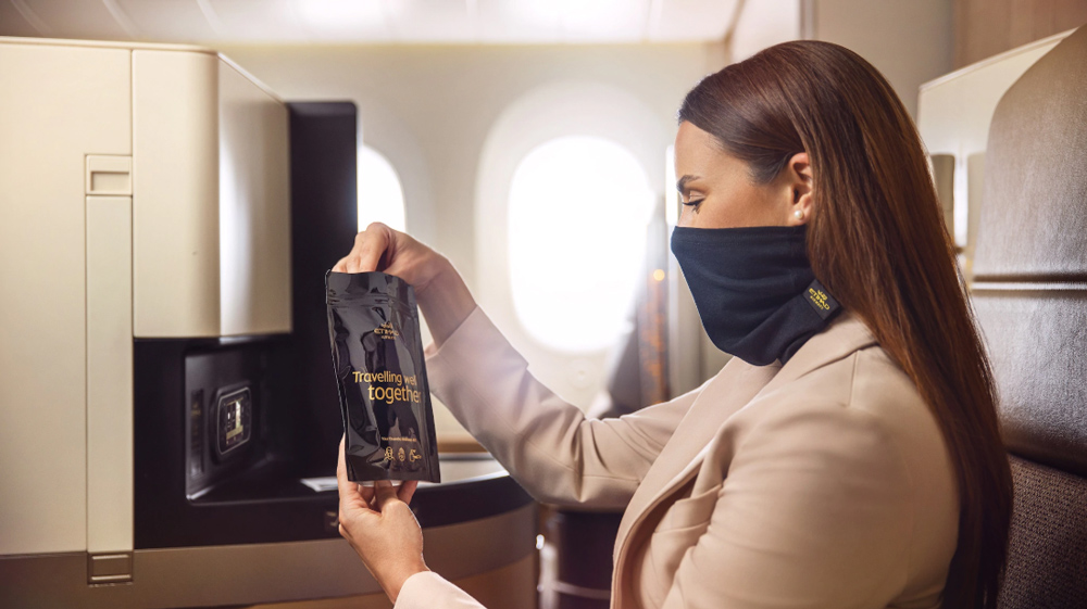 First and business class guests of Etihad Airways will now be issued with a snood-style facemask for their journey as part of the airline’s new health and hygiene program.