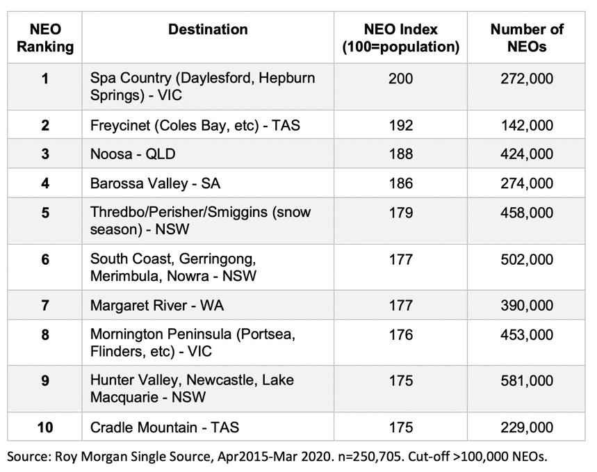 Roy Morgan’s data shows that “NEO-preferred” destinations are spread nationally, with Victoria’s Spa Country the favoured spot.