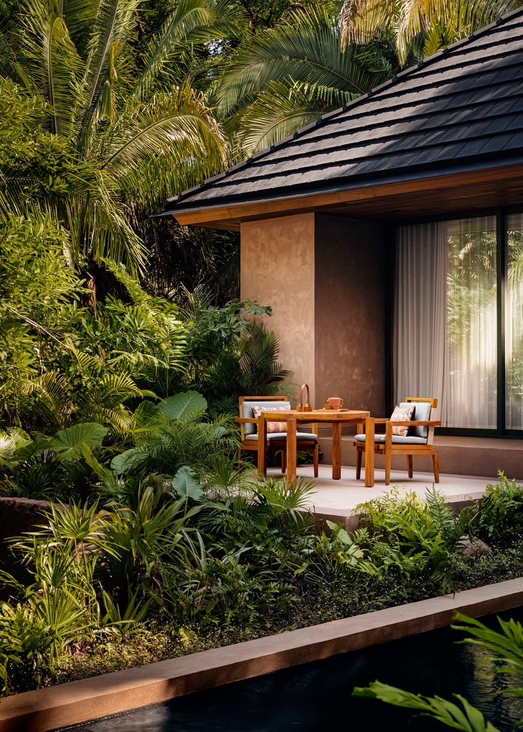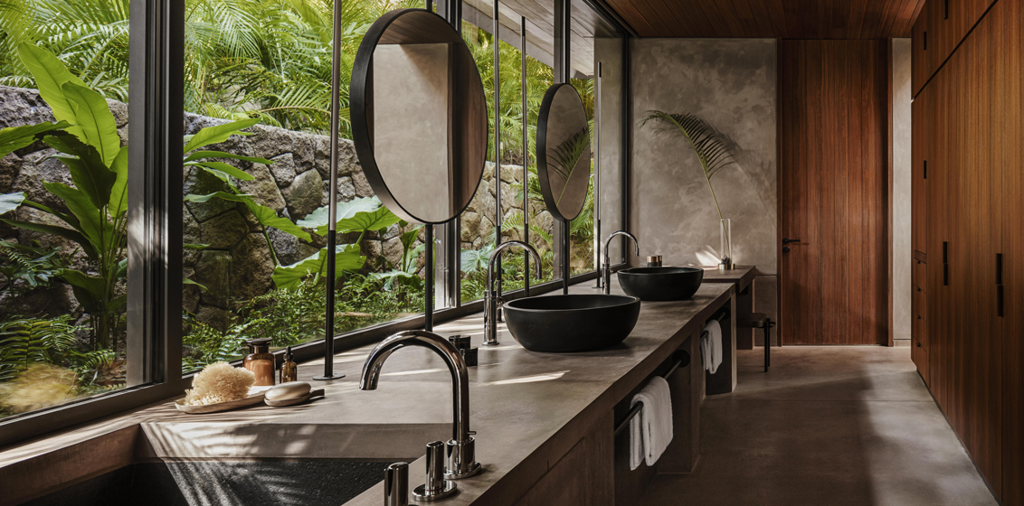 Constructed with clay, wood, precious metal and stone, all indigenous to the region, the villa accommodations are private sanctuaries, grounded in the earthen spirit of the local Cora and Huichol cultures. The floors, walls, and ceilings in the Treehouses are all consistent in the local Cumaru wood to heighten the impression of living lightly in the canopy, disconnected and one with nature. In contrast, the Cliff Villas, built on the volcanic land set upon the mountain top, feature concrete floors and high, sky-lit ceilings above the heavy stone walls and wooden built-ins in Cumaru with a raw finish. Terraces and courtyards are made from volcanic rocks directly sourced from the location while the tropical rainforest provides woods including Cumaru, Rosa Morada, and Tornillo.A special touchpoint in the villa design is evident throughout the bathrooms, which include either an outdoor shower in an immersive jungle setting, some with ocean views (Cliff Villas), or an outdoor soaking tub with jungle or ocean views (Treehouses). In the Cliff Villas, bathrooms open to their own rainforest courts with lush vegetation and ample sunlight piercing through the tree canopies. In the Treehouses, bathrooms are fully glazed and immersed in their surroundings, allowing for natural light to enter the room from different angles, directly through a skylight, in the morning filtered by the vegetation, and open to the setting sun in the evenings.