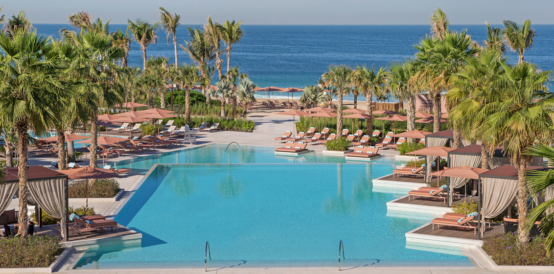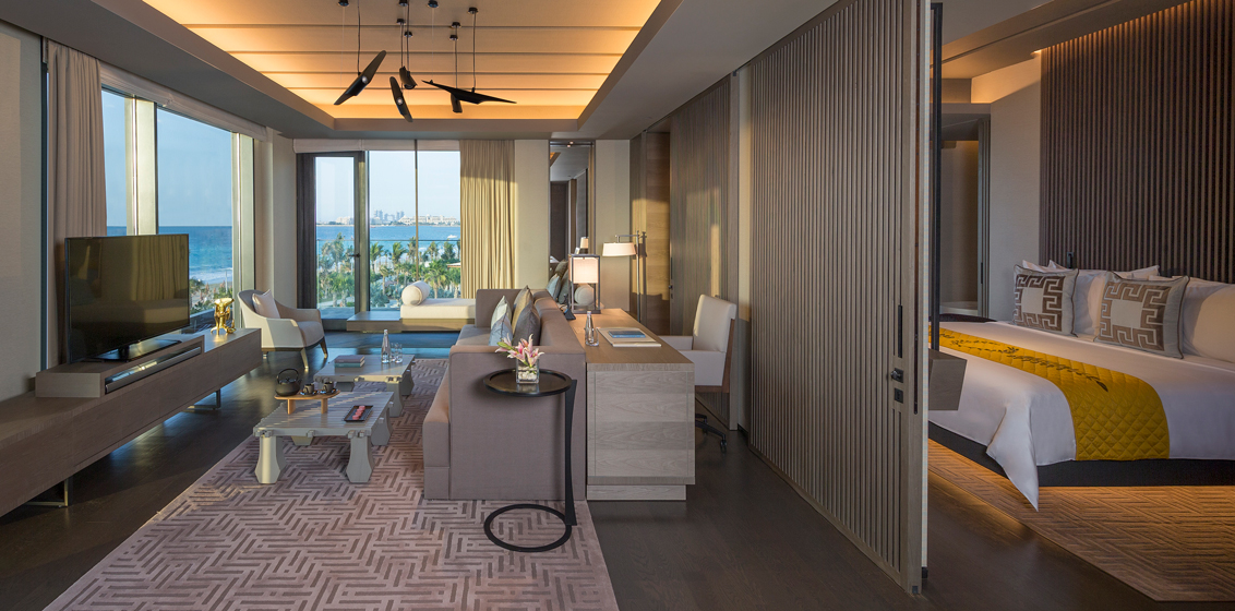 This is a five-floor hotel on Bluewaters man-made island, and all 189 rooms and suites have ample glass-walled balconies looking directly down at lush green gardens, with, 100 metres beyond, what locals say is the best beach in Dubai, with the blue ocean beyond. Turn slightly to one side, and you see what will be the biggest Ferris wheel in the Middle East, opening in a couple of months’ time.