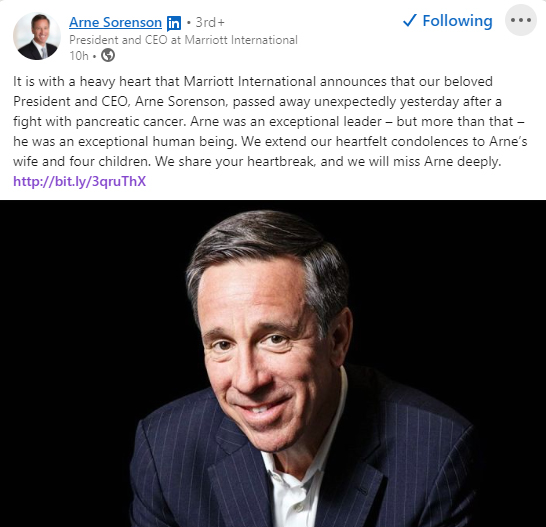 “It is with profound sadness that Marriott International announces that Arne M. Sorenson, President and CEO, unexpectedly passed away on February 15, 2021,” the hotelier said in a statement.