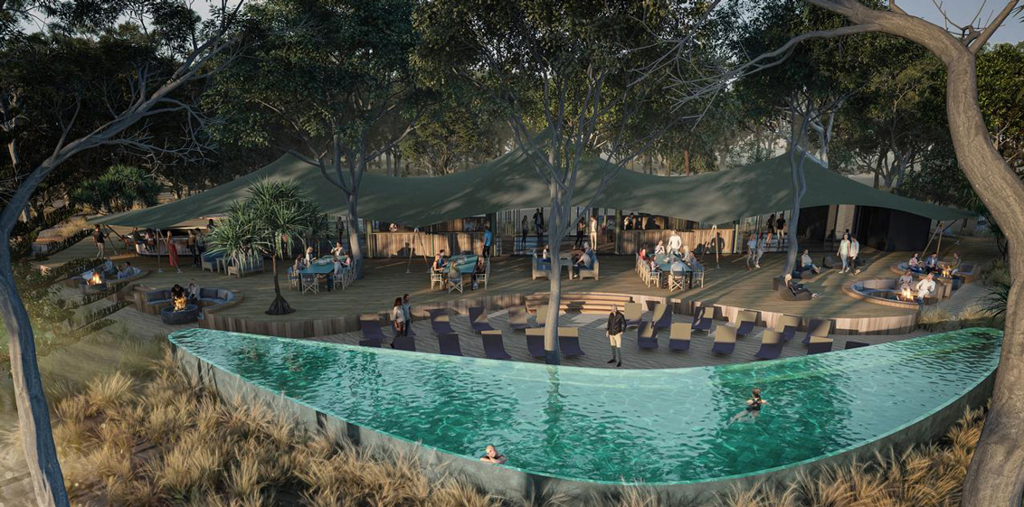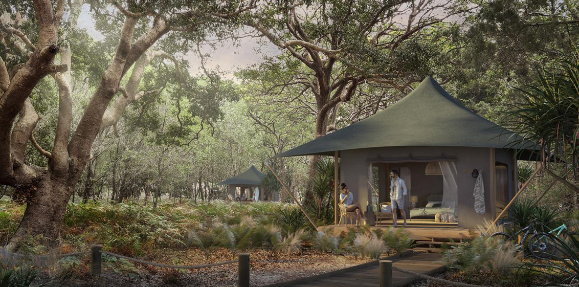 A development application for the proposed Pandana South Stradbroke Island calls for 40 eco-friendly luxurious glamping tents with bathrooms, set in bushland and spread along 230-metres of beachfront.