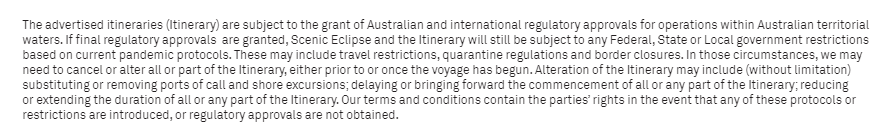 It is unclear if the onboard submarine, Scenic Neptune, will be operational on the local voyages. A clause in the brochure states that helicopter and submarine experiences are also subject to regulatory approval.