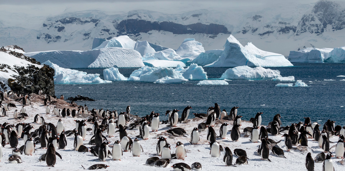 Cuverville Island boasts the largest known colony of Gentoo penguins. Icebergs commonly become trapped and grounded in the nearby shallows.
