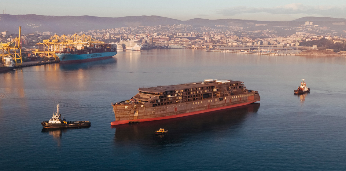 The Seabourn Venture hull, which has been built up to deck 9, moved onto a special barge on 20 March and started the 1,200 nautical mile trip to Genoa on 30 March. Seabourn Venture has been under construction at the T. Mariotti San Giorgio di Nogaro shipyard and is already equipped with engines, generators, and main equipment of the engine rooms.