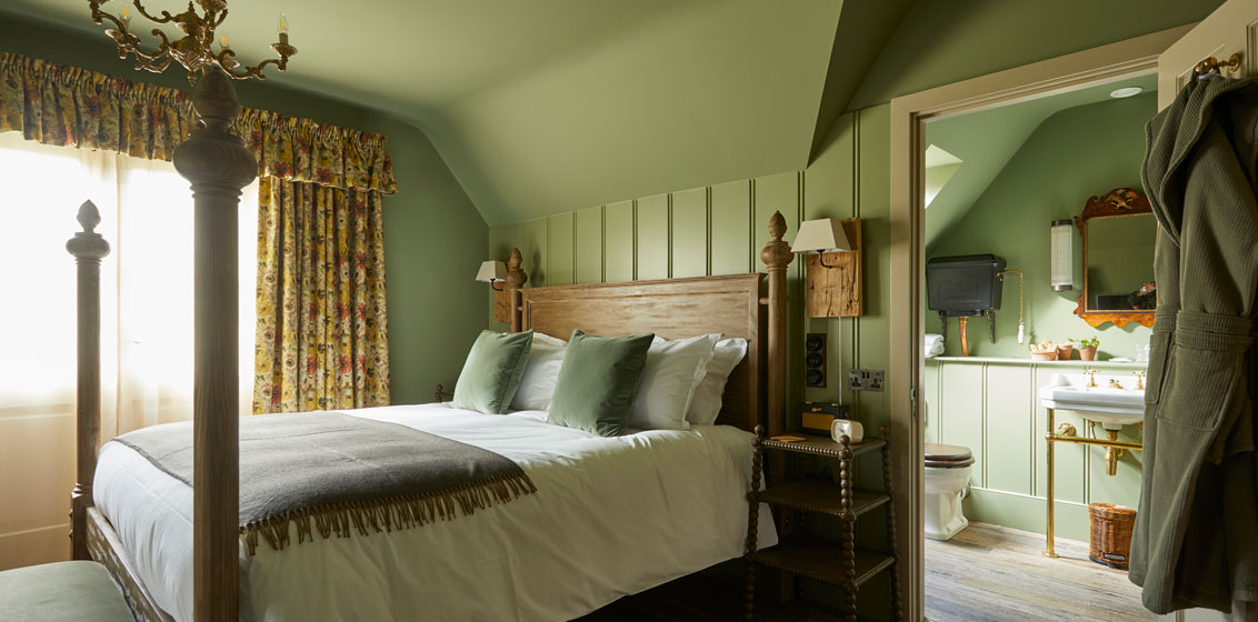 What is essential here? An organic treatment in the Potting Shed spa, local walks, admiring the hotel’s own mini farm – bees, hens, pigs and sheep – and its immaculately-planted produce garden, where the conservatory serves flatbread-type casual meals. And, as with all PIG hotels, the main restaurant, which ’25-mile radius’, is scrumptiously flavourful.Eat inside, under lights once hanging in Battersea Power Station, or on the terrace, as I did, next to a galvanised iron tub of fledgling broad bean plants looking across the stream at another field. Up-cycled wood tables are set with car-boot china and bone-handled cutlery, and addictive rosemary-infused olive oil to go with slices of wholemeal bread brought as you check the menu.