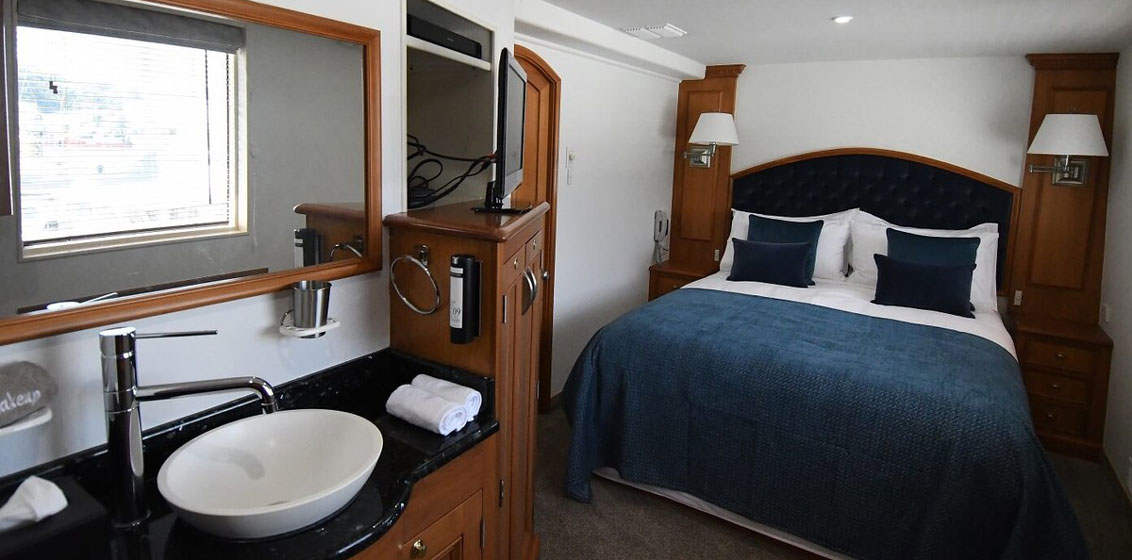 Tastefully decorated, Heritage Explorer’s contemporary wood-finished interior features 10 well-appointed cabins; a dining room boasting spectacular 180-degree panoramas and theatre capabilities; lounge and bar featuring a flight of inclusive regional New Zealand wines, beers and spirits; and a well-stocked local library.