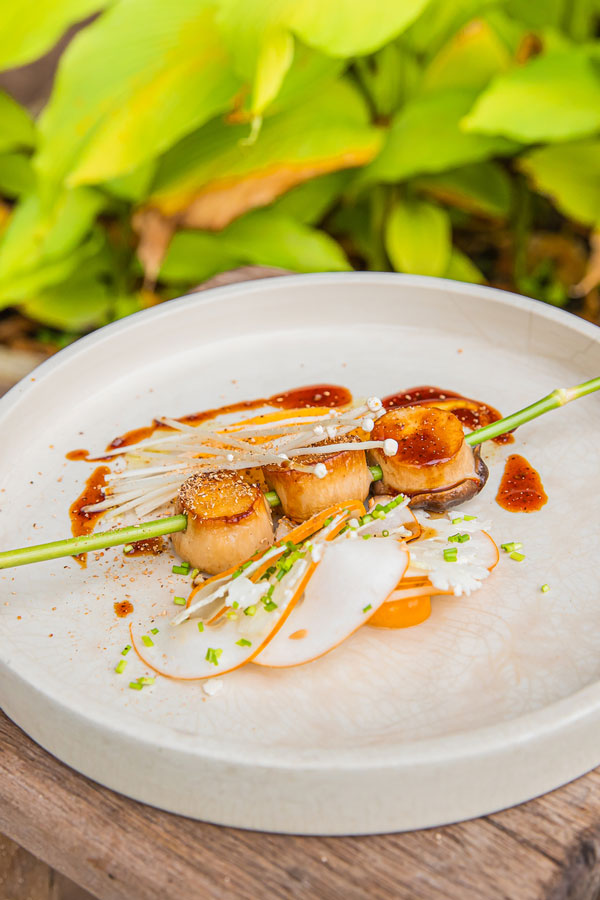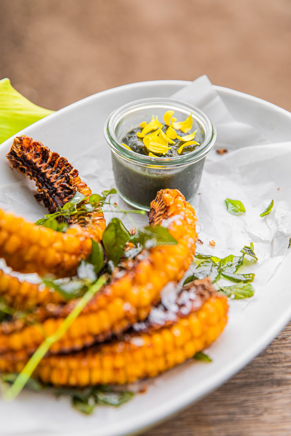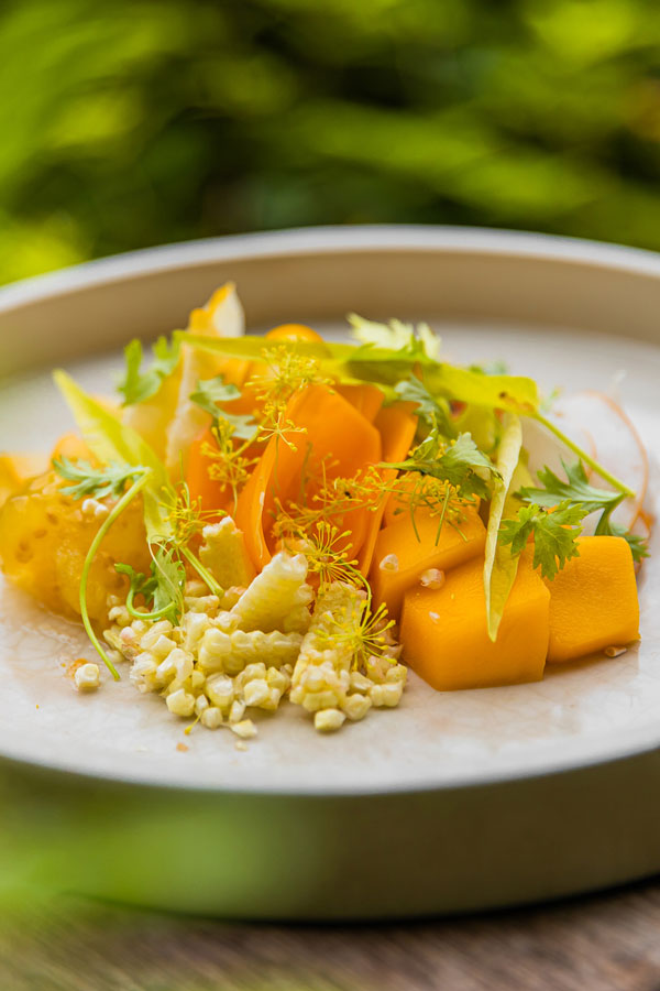 Highlights include: the Purple menu’s Cleansing hibiscus kombucha, blue potato chips and salted beetroots, and Crispy aubergine, with rouille, blue potatoes, prickly ash vinegar, amaranth, wild garden purslane and sweet basil flower; Raw pumpkin, orange beetroots, almond ricotta, leek ash, finger lime, garden flowers, carrot chips and herb soya on the Orange menu; the Yellow menu’s Grain course, with triple- cooked carrot, fermented black garlic, Maldivian curry, coconut sour cream, black truffle and Japanese spring onions; Fire on the Green menu, with grilled pressed portobello mushroom, pea purée, salted lemons, raw asparagus, ramson flower, shitake, morels krapow and crispy holy basil; and the Red menu’s Sweets, with chocolate, beetroots, almond cake, porridge ice cream, raw sun choke, caramelised ginger and garden herbs.