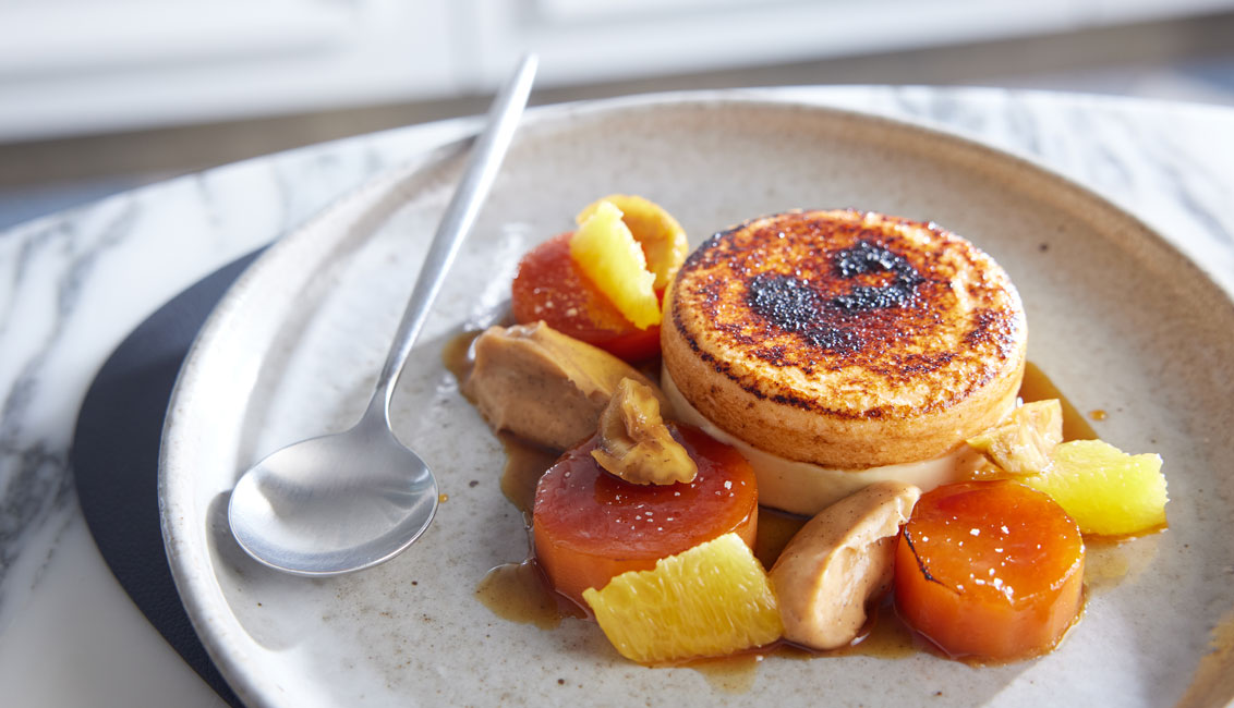 Winter spices and citrus notes are the hero in a must-try modern take on s’mores with fire roasted baby sweet potato with orange marshmallow, frozen lemon myrtle curd and chestnut.