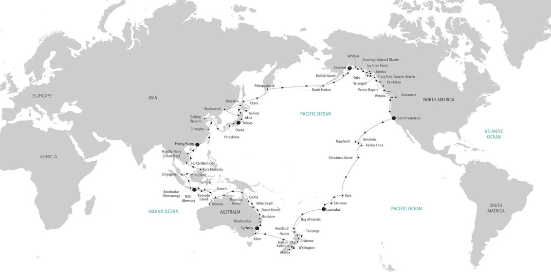 The roundtrip voyage will depart San Francisco on 15 January 2024 and encompass most of the Pacific Rim including Hawaii and Pacific isles, to Australia and New Zealand, through Southeast Asia, China, Japan, and the Russian Far East, and back across the Pacific to Alaska, Canada, and California.
