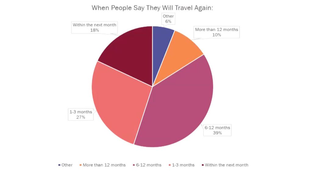 Another poll conducted on 30 July gauged traveller preference as to when they would be looking to travel again, with nearly one-fifth (18%) saying they would travel within the next month, over one-quarter (27%) saying they would travel within the 1 to 3 months, the majority (39%) within 6-12 months and 10% suggesting they aren’t willing to travel for at least the next 12 months.