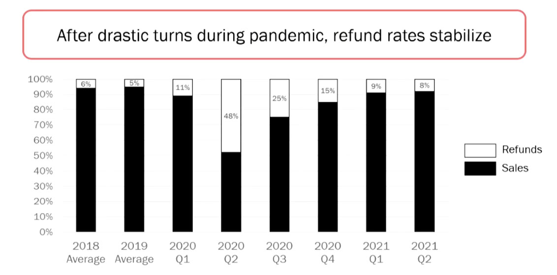 The second quarter of 2021 showed a stabilisation in refund processing by Virtuoso members. In pre-pandemic years, the average refund rate was 5-6%, but that number surged to nearly 50% in Q2 2020, only dropping to 25% in Q3. The figure has now returned to a mark of around 8-9%.