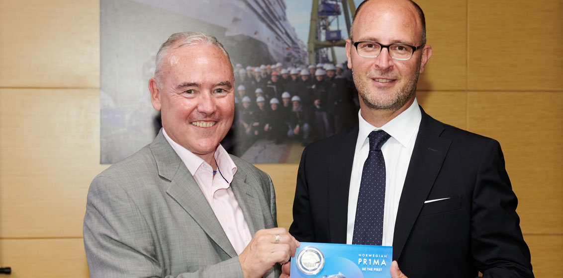 To celebrate the occasion, a commemorative coin was welded to Norwegian Prima in a traditional maritime ceremony presided over by Eamonn Ferrin, VP of International Business of Norwegian Cruise Line and Antonio Quintano, shipyard director of Fincantieri.