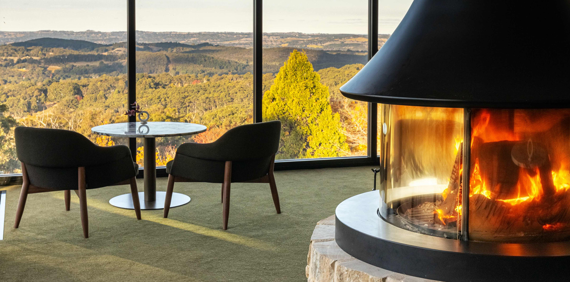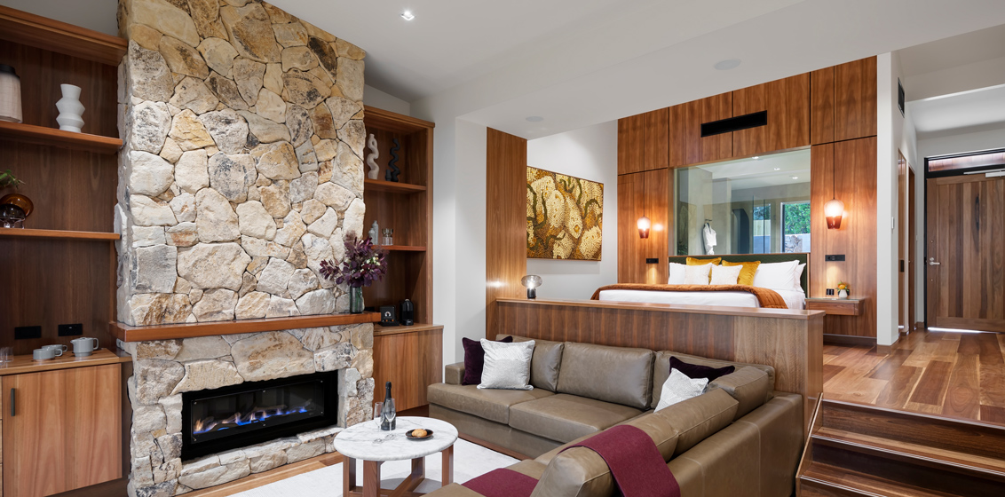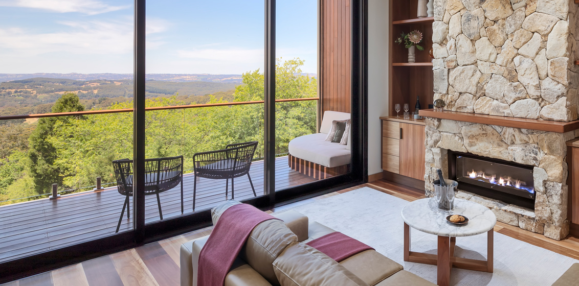 The 75sqm open-plan suites boast 180° views of the patchwork Piccadilly Valley below from every part of the suite. The rooms feature sunken lounges complete with stone fireplaces, king-size beds with moon windows, expansive balconies with outdoor daybeds, a hidden television, elevated free-standing bathtubs, switch-glass privacy windows and heated floors along with the most technologically advanced automation in any hotel room in Australia.