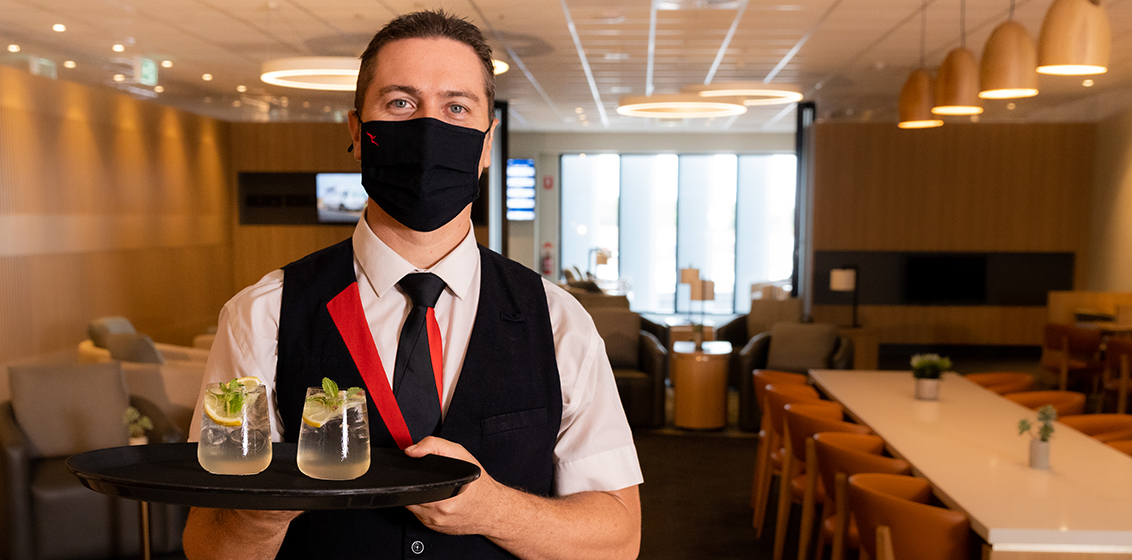 Lead image: Qantas Lounge crew member presenting Top End Lemonade
