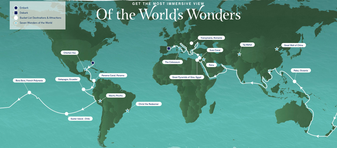 “We are thrilled to finally unveil our World Voyage. With opportunities to visit the Seven Wonders of the World and other iconic sites such as the Great Barrier Reef, the Galapagos, and the Black Sea, we are allowing our guests to check off all their bucket list destinations in one sailing and to connect with more countries and cultures than ever before,” said Carol Cabezas, President of Azamara.