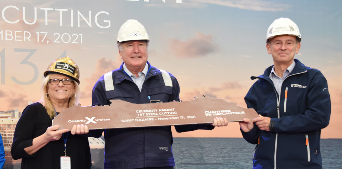 Lead image: Company executives including Celebrity Cruises CEO Lisa Lutoff-Perlo, Celebrity Cruises SVP of Hotel Operations Brian Abel, Celebrity Cruises CMO Michael Scheiner, and Captain Kate McCue signed the ceremonial first cut of steel for the fourth ship in Celebrity Cruises’ Edge Series, Celebrity Ascent, at the Chantiers de l’Atlantique shipyard in Saint-Nazaire, France.