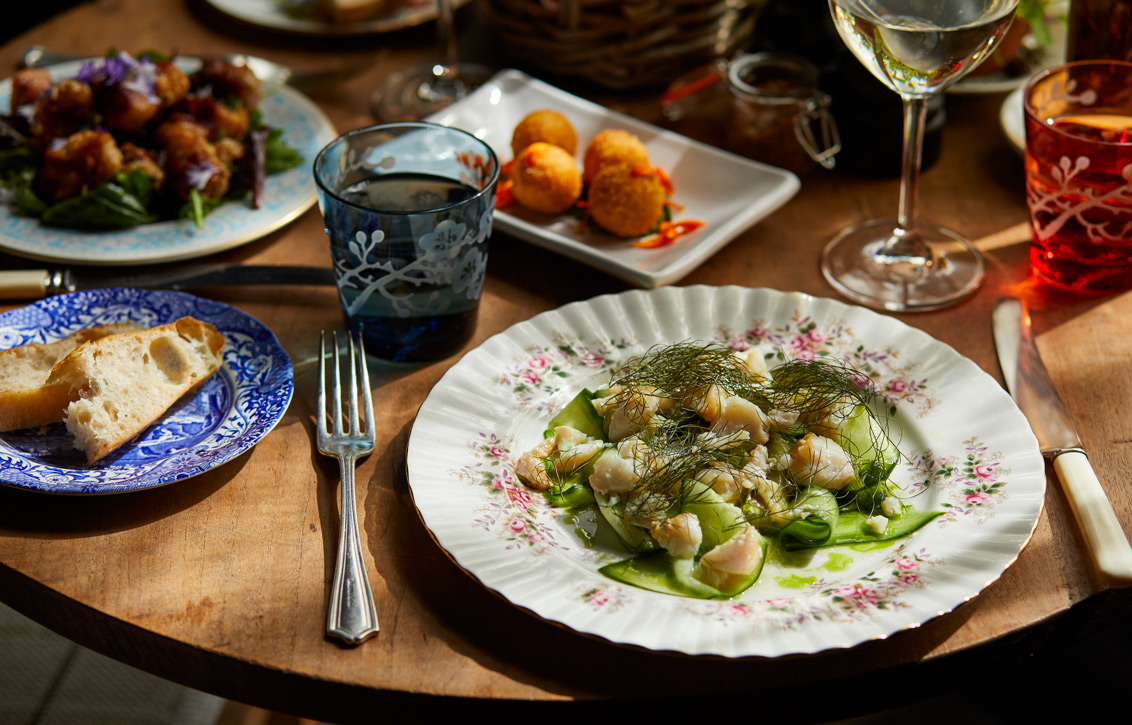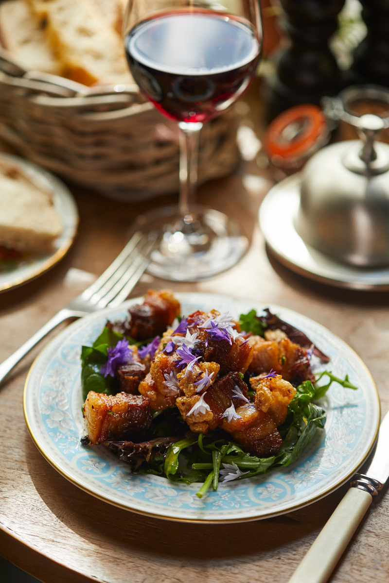 Drink, and eat, in the brand-signifier giant conservatory attached to the main house. Your well-scrubbed old-wood table bears a living strawberry plant, and yummy herb-infused olive oil, plus local butter. The chef, Kamil Oseka, one of few non-Brits making this PIG so memorable, is immediately keen to show off his pickling room, fruits of a passion learned from his grandmother back in Warsaw: he takes you through the kitchen and wants to talk for ages about how he started pickling here in early Summer 2021. We were later brought some pickled one-bites with the ‘Piggy Bits’ (crackling strips with tiny dollops of applesauce), ordered to go with cocktails. We sat in the Drawing Room, a lounge with William Morris-look wallpaper matching sofas’ upholstery.