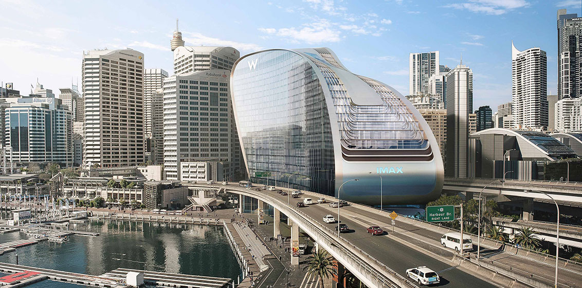 W Sydney’s undulating ribbon form rises through two elevated roadways on Sydney’s Darling Harbour, creating a spectacular waterfront experience, and will showcase 585 guestrooms, suites and studio suites – the largest W Hotel in the world – all with unparalleled city and harbourside views.