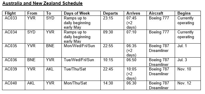 Air Canada’s flight schedule for the South Pacific is currently as follows: