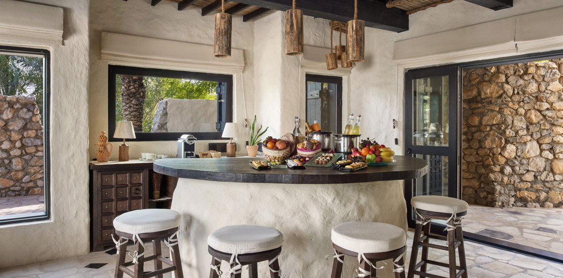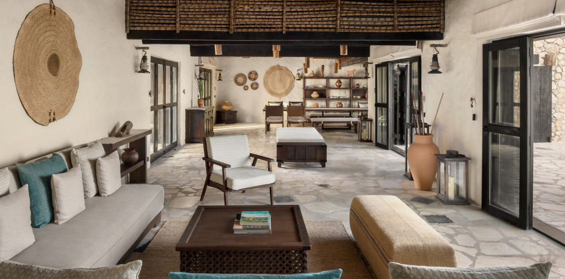Inspired by the beauty of Zighy Bay, palm leaf and wicker designs are intricately crafted into the interiors. All three villas were fitted with furnishings sourced from South Africa, Lebanon, India, and the UAE, giving them a modern take on their rustic design. From handwoven fabrics for cushions and throws to rugs and wall furnishings, each piece was handpicked by the team to add to the warmth of the room.