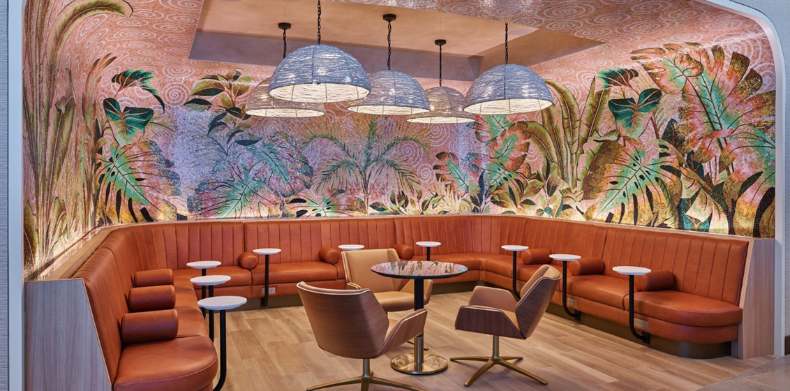 The lounge is outfitted with seating options to accommodate a wide variety of travelers, including private phone booths for quiet work and theatre-style seating for viewing the media wall. Club restroom amenities have been optimised for guest comfort and privacy and include a nursing room, oversized family restrooms and eight spacious showers managed via a virtual queuing system.Throughout the Club are hidden gems designed to delight. One such gem is the Coffee Grotto, a nook that offers a glamorous peek into the ambience of Hollywood’s Golden Age with an exquisite mosaic mural featuring glass tiles imported from Italy.