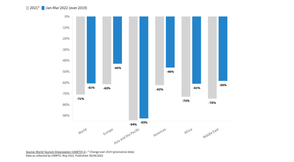 The Middle East (+132%) and Africa (+96%) also saw strong growth in Q1 2022 compared to 2021, but arrivals remained 59% and 61% below 2019 levels respectively.