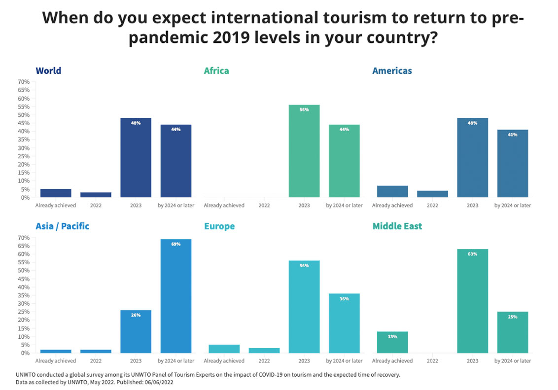 According to the latest UNWTO Panel of Experts survey, a higher number of experts (48%) now see a potential return of international arrivals to 2019 levels in 2023 (from 32% in the January survey), while the percentage indicating this could happen in 2024 or later (44%) has diminished compared to the January survey (64%).