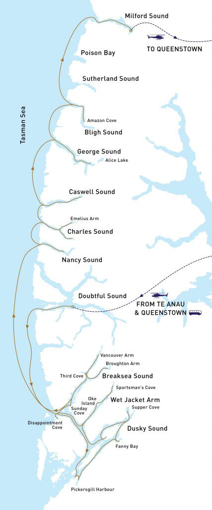 During their time onboard Island Escape, guests explore Doubtful Sound, Pickersgill Harbour, Dusky and Breaksea Sound, Wet Jacket and Vancouver Arm before sailing north to enter Nancy, Charles, Caswell, George, Bligh and end up in the mighty Milford Sound.