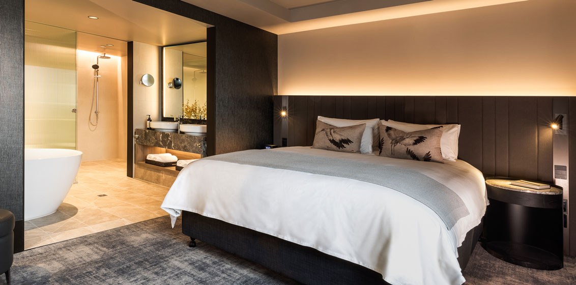 Designed by leading architects DKO, the William Clarke Sky Villa is a luxurious split-level layout villa with a spacious living and dining area, king bedroom, kitchenette and a generous walk-in-robe leading to an opulent bathroom with a free-standing spa bathtub overlooking the MCG.