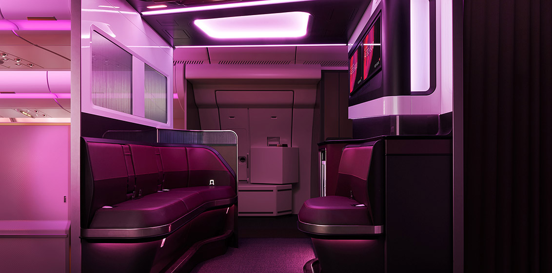 The Retreat Suite is a brand new innovation in Virgin Atlantic’s Upper Class offering and consists of two exclusive suites at the front of the cabin. The airline’s most spacious suite yet, comprising a 6-foot 7-inch direct seat to fully flat bed and a 27-inch touchscreen with Bluetooth connectivity and wireless charging. With each suite boasting an ottoman that doubles up as an extra seat, up to four people can comfortably dine or chat in their own private social space. Customers can enjoy an intimate dinner or settle in comfort to watch a film.