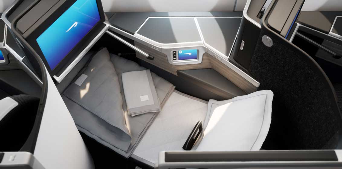 The newly designed Club Suite seats in Club World offer direct-aisle access, a suite door for greater privacy and luxurious flat-bed seats in a 1-2-1 configuration.