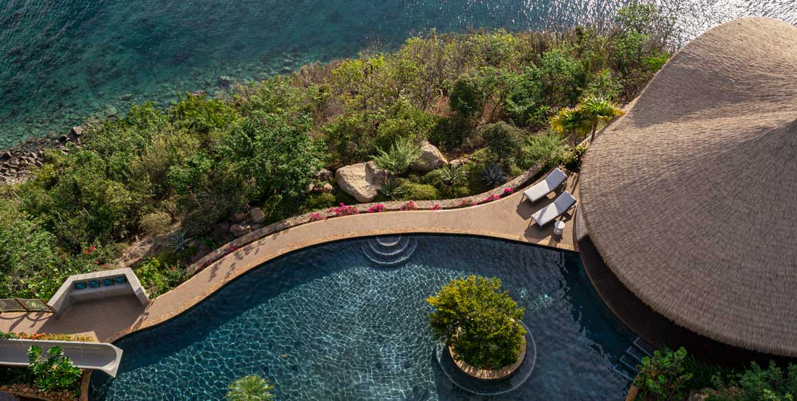 Taking center stage of The Village is the vast undulating multi-level infinity-edge pool that is anchored at either end by the Main Pavilion and Dining Pavilion and lined with palm trees that create a tropical oasis inspired by the flavours of a Balinese garden. Unique features are perfectly designed into the pool spaces, with a submerged dry lounge, swim-up bar and second pool that leads to the Master-Suite – all enhanced by breath-taking views and the surrounding calm of Caribbean waters.