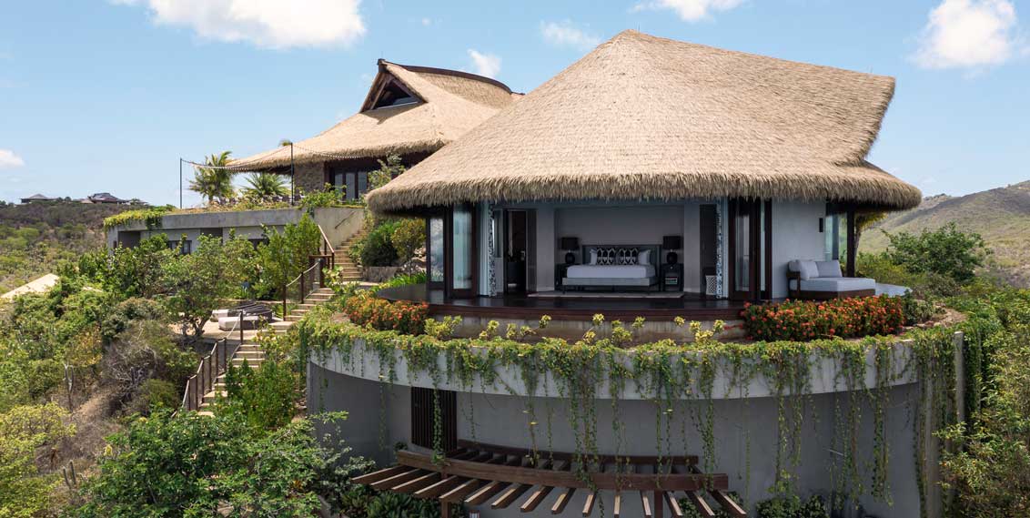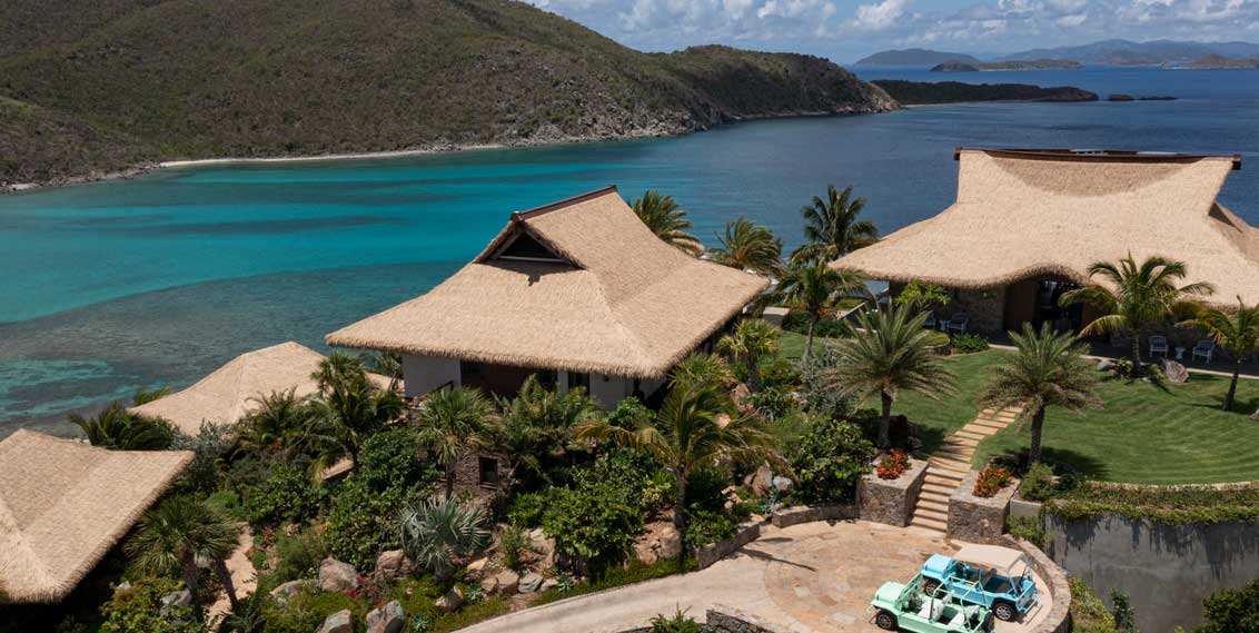 Perched on the furthest western tip of the island with astounding sea views across to Virgin Gorda, the 1,680 sqm estate presents a strikingly modern design comprised of multiple cottage-like structures that nestle into the topography, showcasing thatched roofs that blend naturally into the landscape.