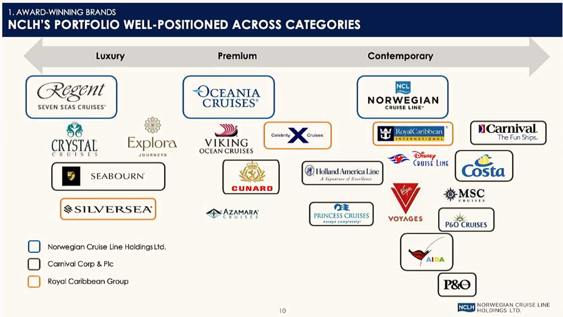 While deliberately not verbally mentioning competitors in each of the three categories by name, a slide in his presentation showed seven cruise lines in the Contemporary space alone, all operated by Carnival Corporation (Carnival, Costa, P&O Cruises, Aida, Princess Cruises, Holland America Line and P&O Cruises Australia).